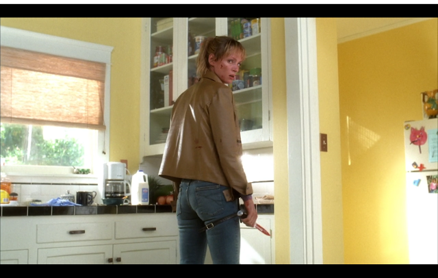 The Bride keeps her eyes locked on Vernita’s every move as she exits the room. She is placed on the right side of the frame, in between the archway and the counter, making her feel sort of trapped.